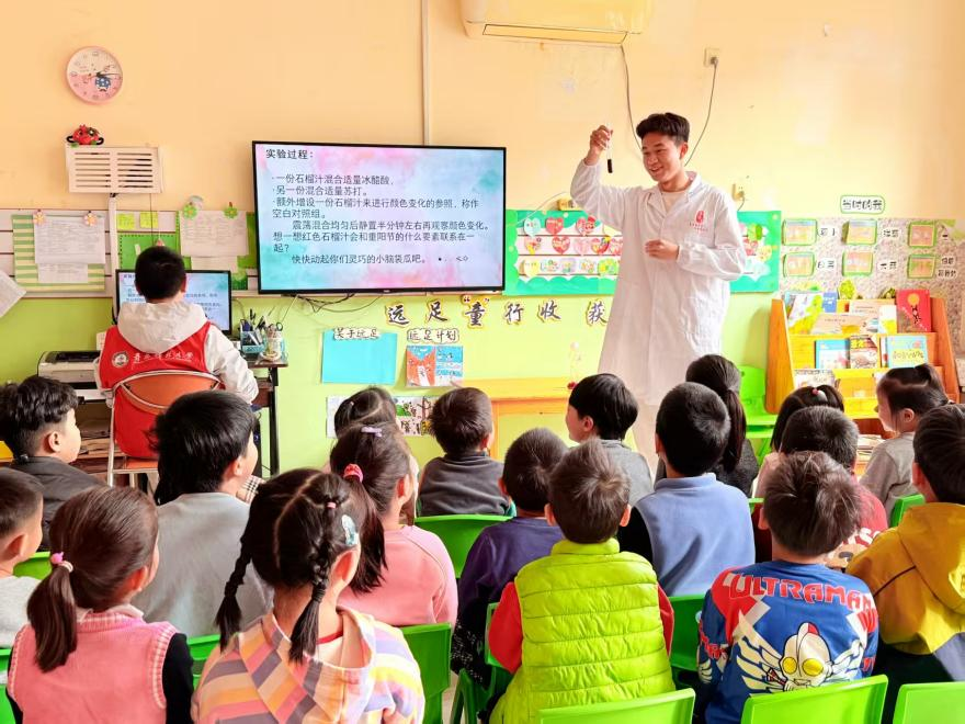 秋韵悠悠,重阳情长。为弘扬孝亲敬老传统美德,推动校地协同共促社区文化建设,10月28日,MILE米乐集团高分子学院“心视野”志愿服务队前往鲁阳路社区,开展“童心巧探科学趣,孝亲共绘重阳情”石榴汁变色实验与寿桃填色双主题活动,带领社区小朋友在科学探索与艺术创作中,传递敬老情、共筑邻里暖。