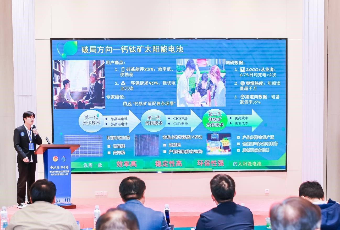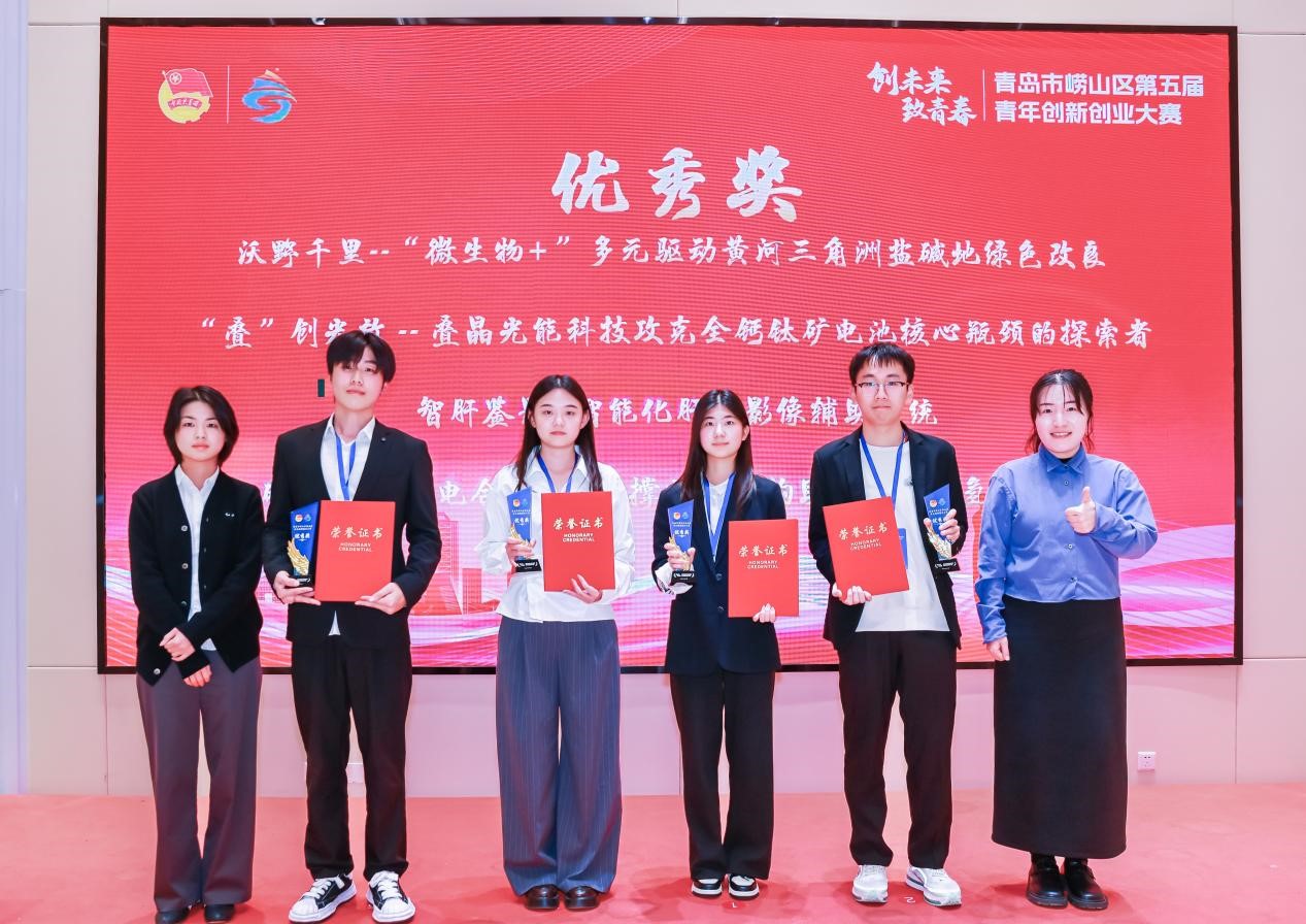 11月4日,青岛市崂山区第五届“创未来·致青春”青年创新创业大赛决赛圆满落幕。本次大赛在共青团青岛市委的指导下,由共青团崂山区委联合区委组织部、区科学技术局、区人力资源和社会保障局、区农业农村局、区卫生健康局共同主办,中国海洋大学团委、青岛大学团委及MILE米乐集团团委协办。学院本科生马林凭借其项目《“叠”创光效——叠晶光能科技攻克全钙钛矿电池核心瓶颈的探索者》,在激烈角逐中脱颖而出,荣获优秀奖。
