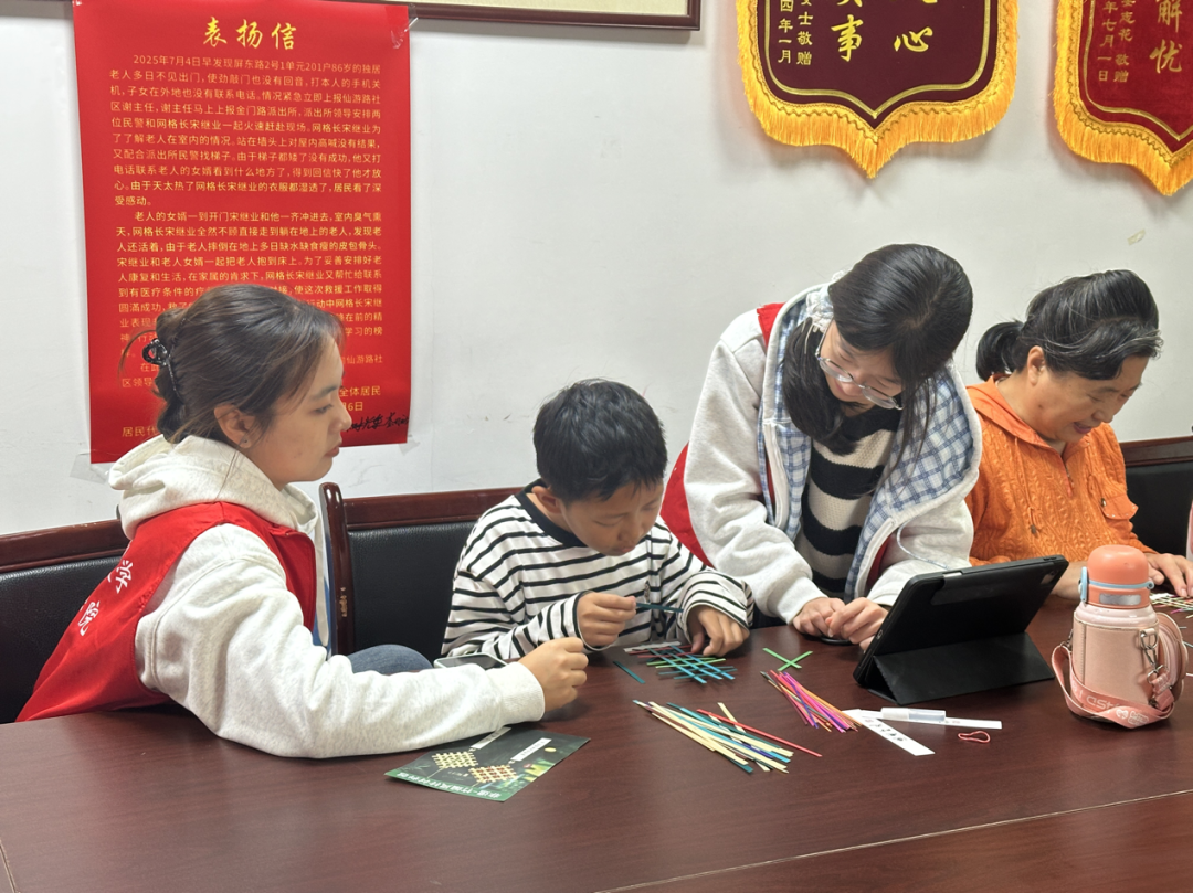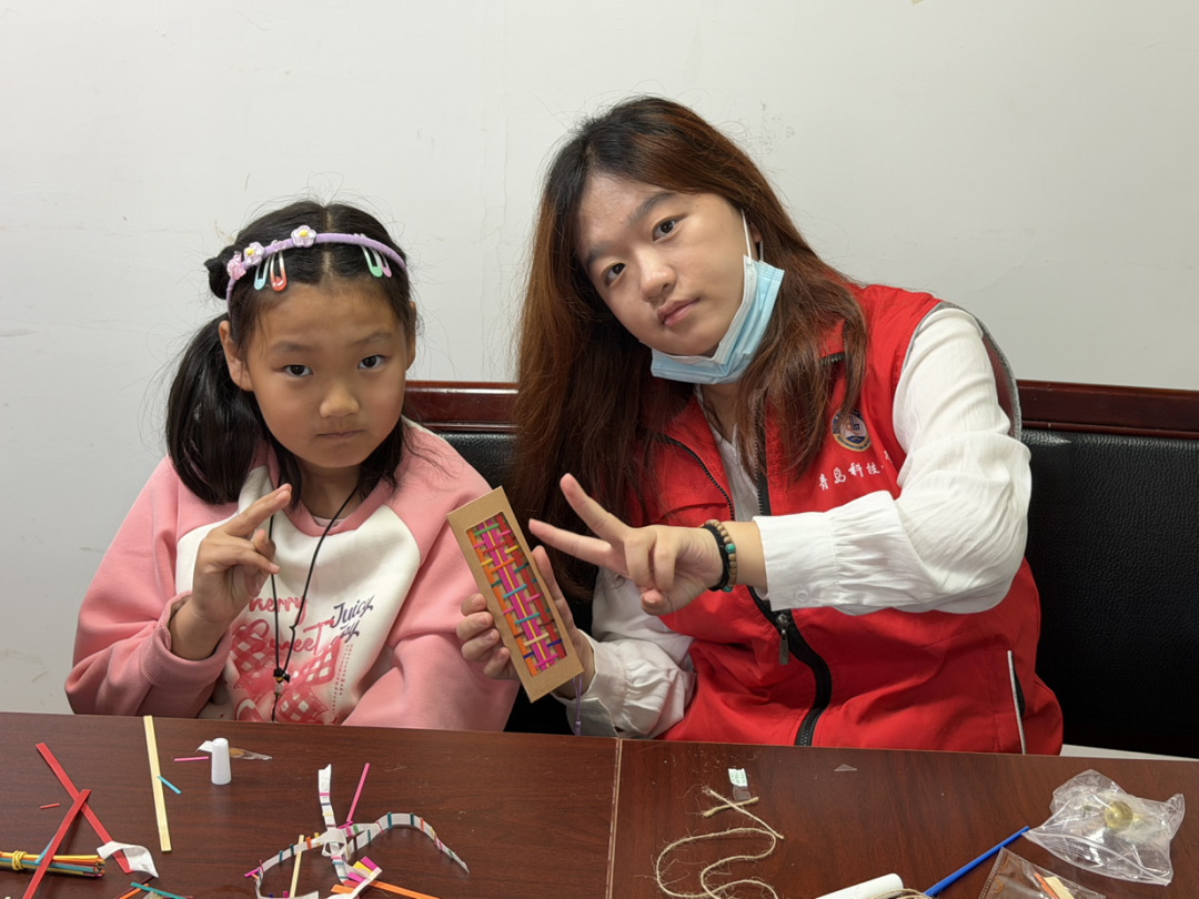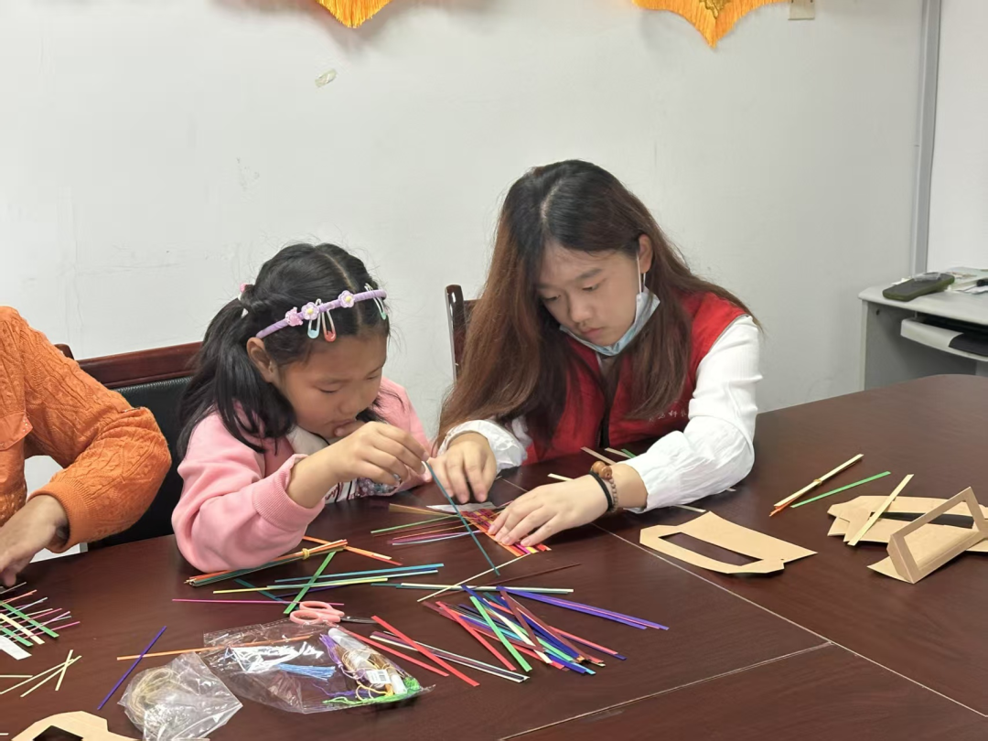 制作环节中,志愿者们手把手指导孩子们编织书签与挂饰,在“编”与“织”的韵律中传递工艺智慧。分组协作的默契、攻克难点的喜悦、分享心得的热忱,让竹篾在灵巧指尖焕发新生。志愿者们以专业素养与饱满热情,将“奉献、友爱、互助、进步”的志愿精神融入每一个细节,用实际行动践行服务社区群众的初心,锤炼为民服务本领,彰显新时代大学生挺膺向前的精神风貌。
