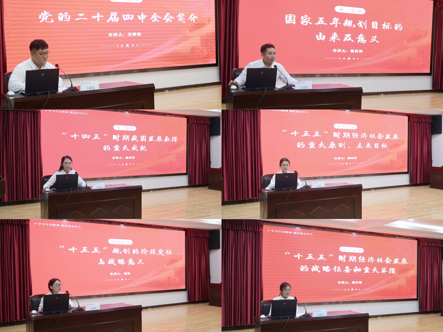在理论报告环节,王靖森、谢云帆等六位同学以《深入学习和贯彻党的二十届四中全会精神》为主题,系统介绍了党的二十届四中全会以及国家五年规划目标的由来及意义,总结了“十四五”期间我国在经济、社会、民生、文化、生态等领域取得的历史性成就,分析了“十五五”规划的阶段定位与战略考量,并就“十五五”规划的重大原则、发展目标与重点战略任务进行了阐释,帮助同学们进一步明确了未来五年的发展方向与实践路径,增强了理论认同和思想共识。