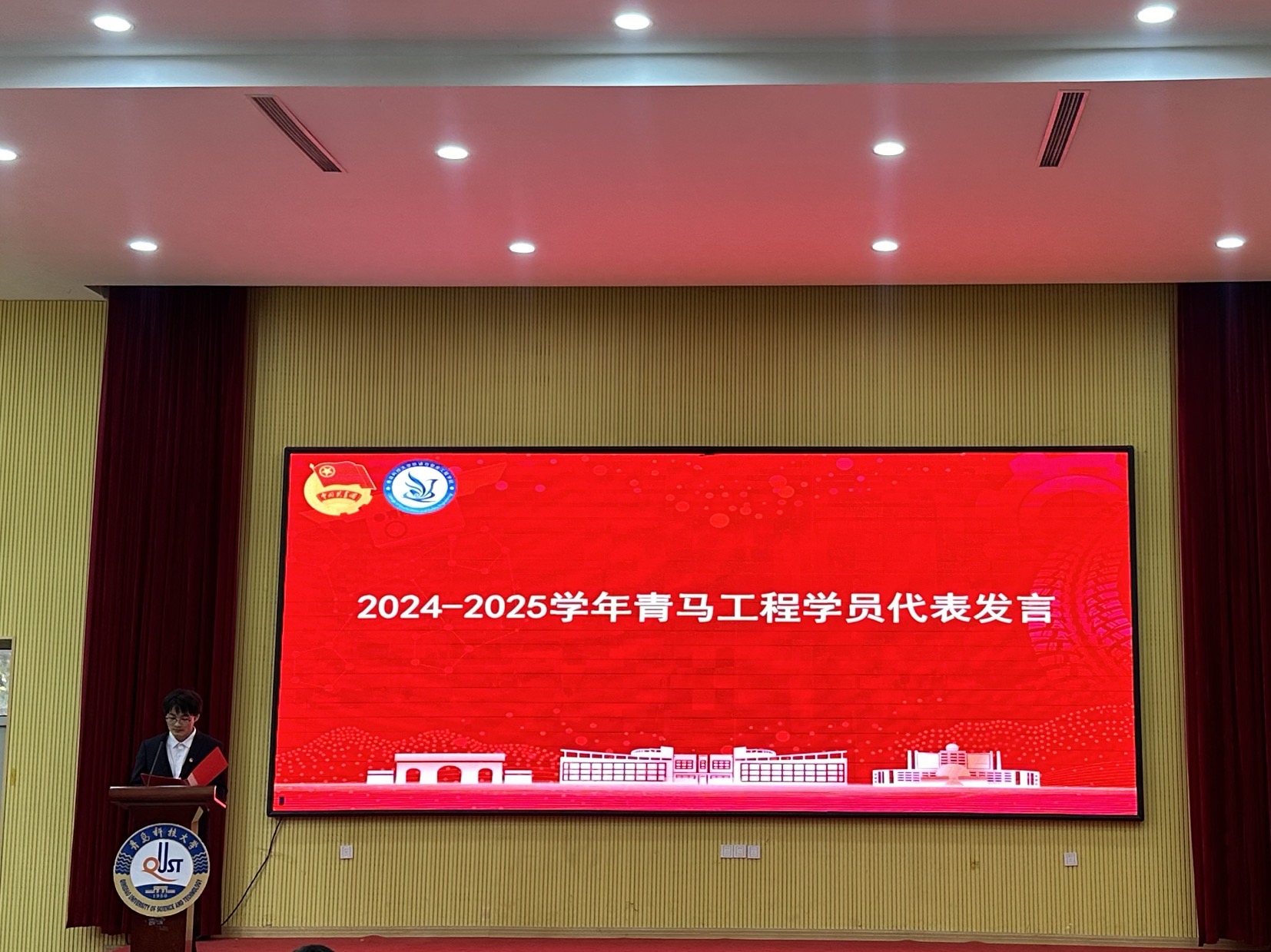 2024-2025学年青马工程学员代表王孝奎发言,他表示,要爱党、爱国、爱社会主义,弘扬“奋进新征程,建功新时代”主旋律,筑牢思想根基、锤炼过硬本领、践行青年的使命担当。