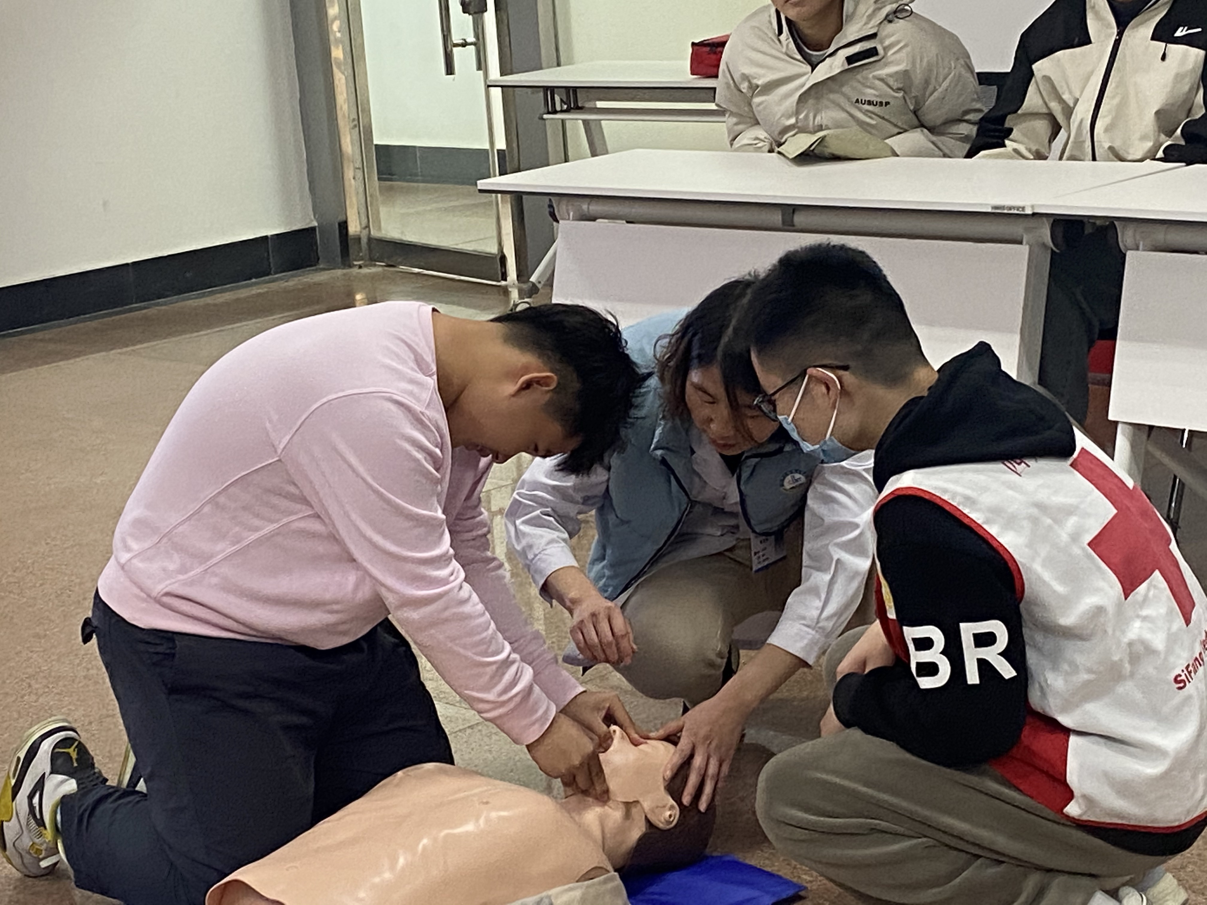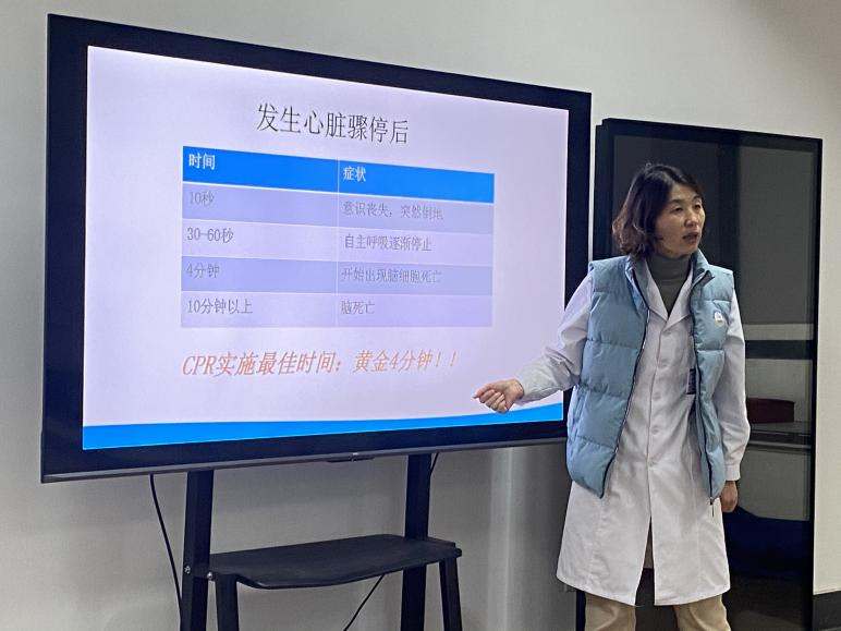 实践操作环节为课程核心亮点,实现理论知识向实用技能的高效转化。高术华通过 “1001 计数法”等口诀,现场演示心肺复苏黄金四分钟操作规范、体外自动除颤器使用流程及海姆立克急救法,结合肢体动作演示强化技能记忆点。董泽瑞同学辅助在场学子进行实操体验,逐一纠正操作细节,确保学子掌握急救核心技能。课程尾声,学院同步发布流感疫苗预约通知,针对当前流感防控需求,特别提醒有接种需求的学子及时咨询办理预约事宜,切实为学子健康提供保障。