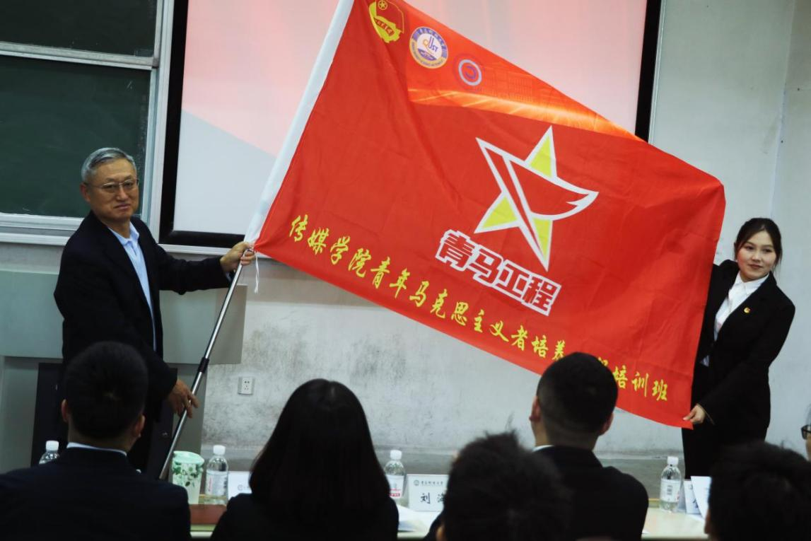 会上,钟兆秀为本期“青马工程”培训班学员代表24级戏影硕士岳馨同学授旗;金莹莹宣读了《传媒学院2025-2026学年“青马工程”实施方案》;赵岩宣读了传媒学院2025-2026学年“青马工程”学员名单。