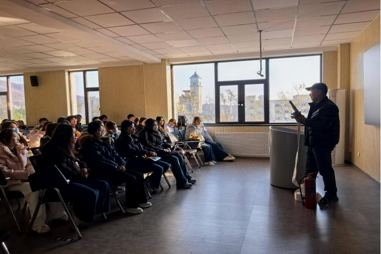 消防安全专员结合高校校园特点,向同学们讲述了学生宿舍和日常生活场所可能存在的火灾隐患,通过理论讲解与案例分析相结合的方式,系统普及火灾成因、初期火灾扑救技巧、疏散逃生注意事项等知识,重点演示了手提式干粉灭火器“提、拔、握、压”的正确操作方法,为演练顺利开展奠定坚实基础。
