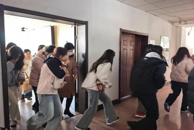 随着模拟火灾警报信号响起,演练正式启动。全体学生按照预设疏散路线,弯腰低姿、捂住口鼻,在工作人员的有序引导下快速撤离至指定安全区域。整个疏散过程紧张有序、衔接顺畅。