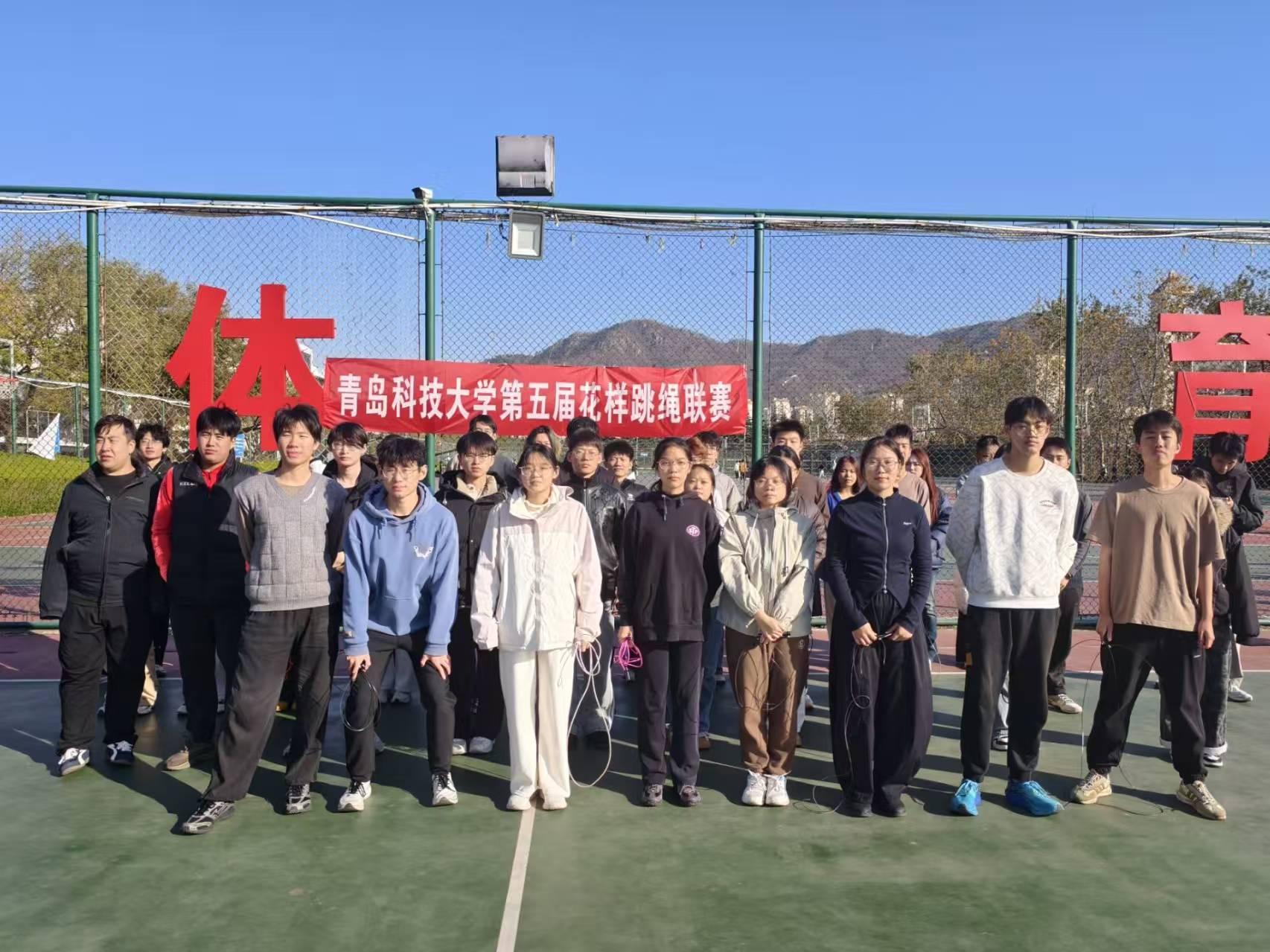 为丰富校园体育文化生活,由信息学院承办的学校(崂山校区)第五届花样跳绳联赛,于11月18日在崂山校区南苑田径场正式开赛,共11支学院代表队参赛。本次联赛内容为10人30秒单摇接力和10人8字跳绳两大集体项目,每支队伍由男女各10人组成。