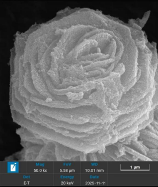 这是一张SEM扫描电子显微镜图,拍摄材料呈现出类似玫瑰花的形态,由层层叠叠的结构组成,细节丰富,在50.0kx放大倍数下,展现出微观世界里独特的“花状” 形貌。