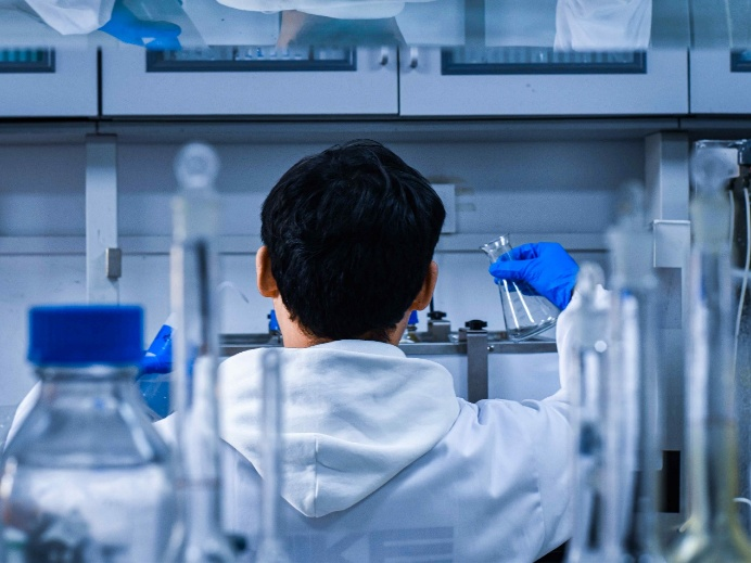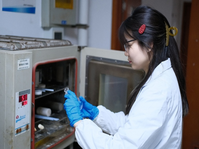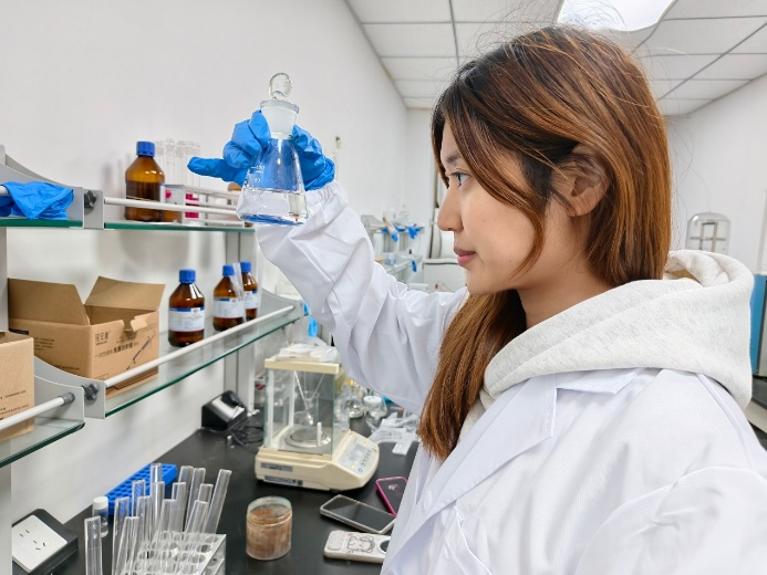 她身着干净的实验服,戴着蓝色手套,专注地捧着盛着透明液体的容量瓶,眼神认真地确认着瓶中液体的状态,在摆满试剂与仪器的实验室里,正投入地进行着严谨又细致的实验操作。