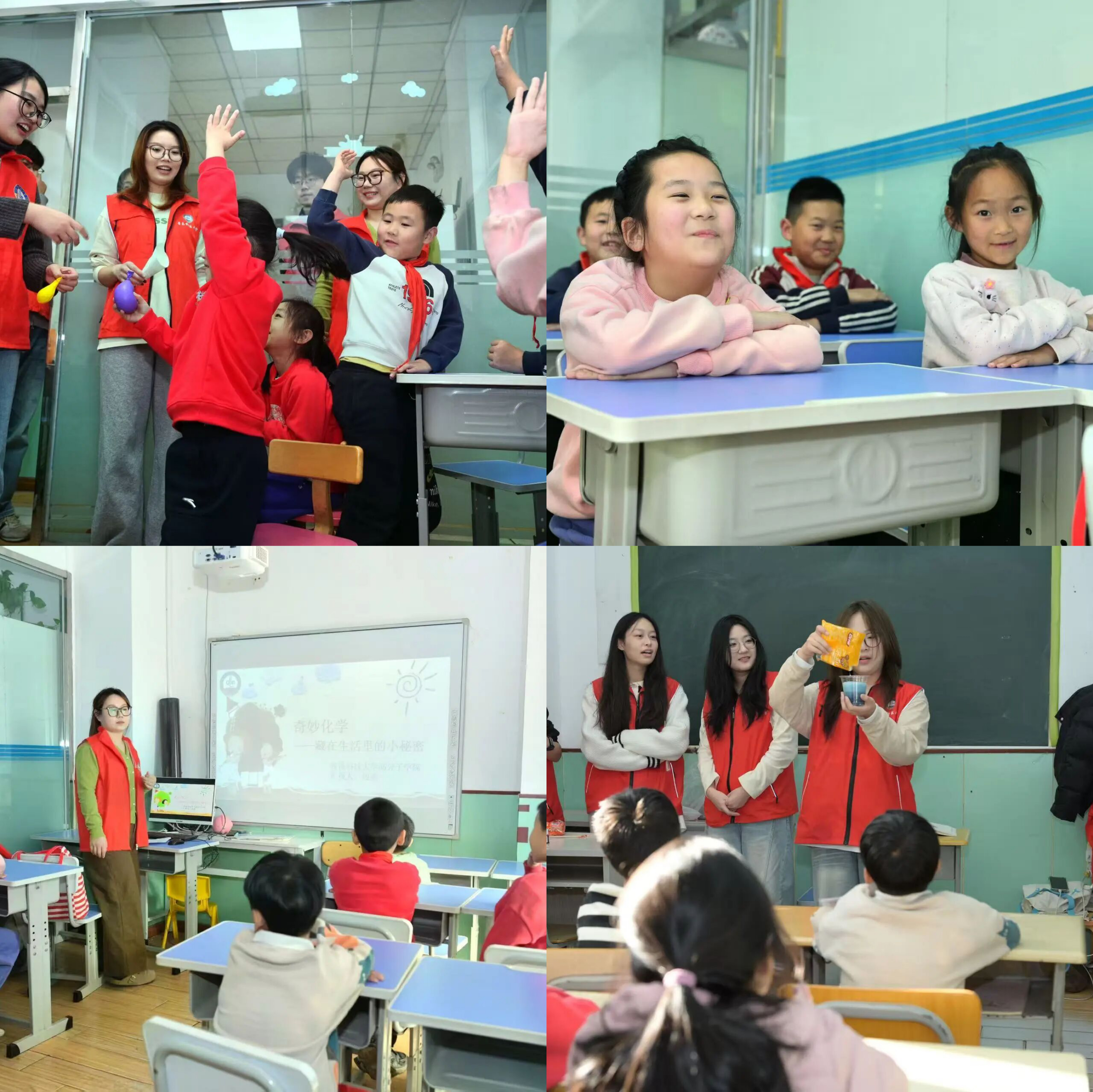 在本次活动中,志愿者们精心准备了童趣化的PPT,搭配通俗易懂的现场讲解与互动问答环节,成功激发了孩子们对化学学科的好奇心。随后,他们更是将虹吸现象、指示剂变色、酸碱反应这些抽象的化学原理,巧妙转化为一系列可视、可触的科普实验。活动现场,志愿者们采用“展示+指导”的方式,引导孩子们亲手完成实验、观察反应现象。