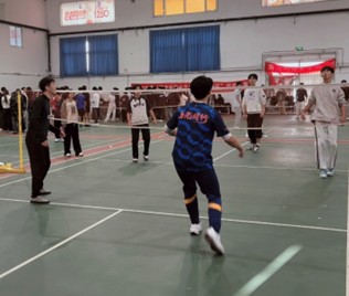 随着哨声响起,比赛迅速进入激烈角逐:队员们配合默契,防守严丝合缝、进攻节奏紧凑;白色毽球似灵动白鸽穿梭赛场,侧身救球、膝盖顶球等高难度动作层出不穷,既彰显了毽球项目的竞技魅力,亦展现出高分子学子的昂扬风采,让赛场充满青春活力。
