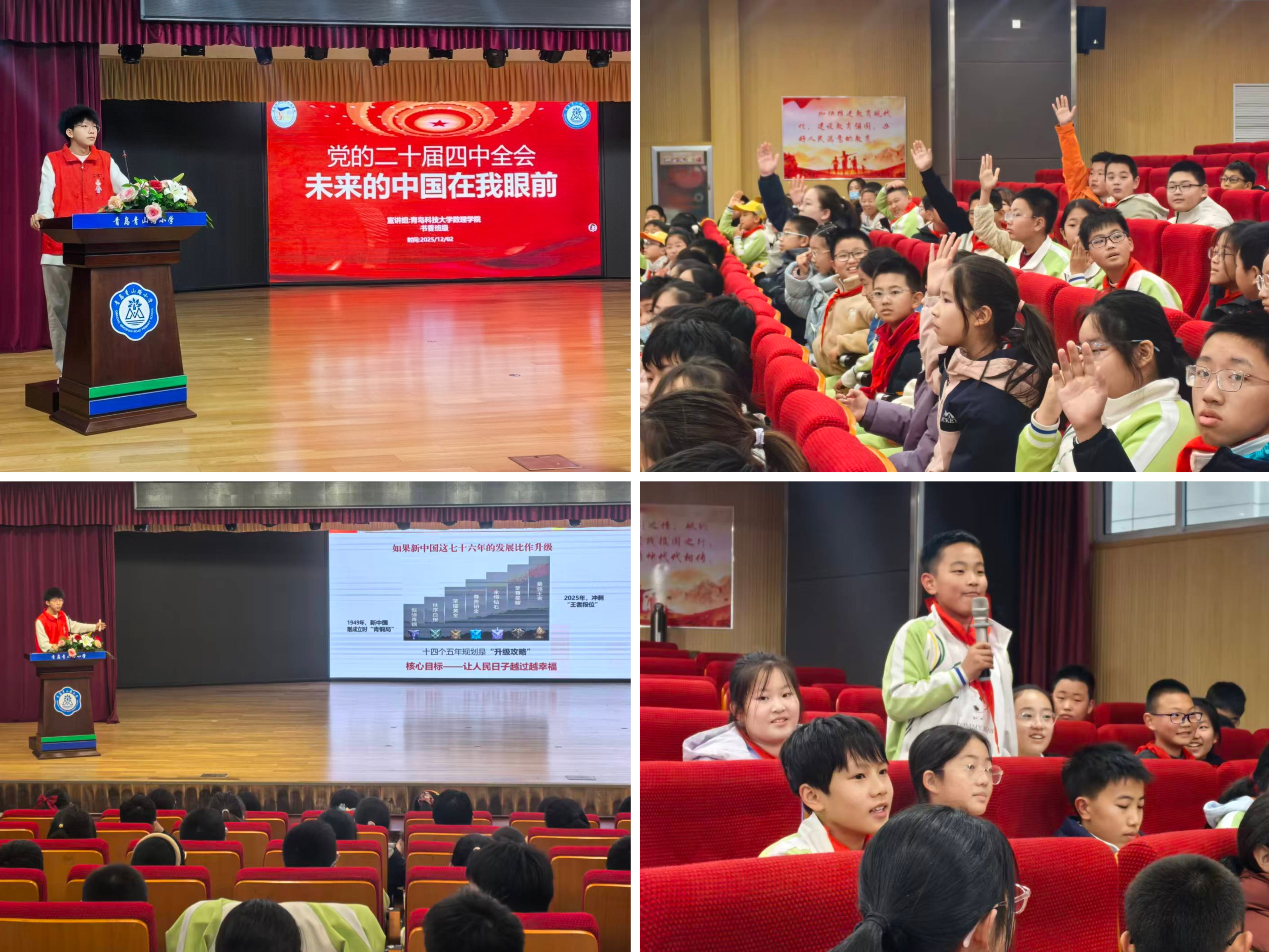 为深入学习贯彻党的二十届四中全会精神,引导少年儿童厚植家国情怀、坚定强国志向。12月2日下午,数理学院书香班级志愿服务队走进青岛市青山路小学,开展“童言童语话发展,薪火相传向未来”主题宣讲活动,与200余名小学生同上一堂“有温度、接地气”的思政课。