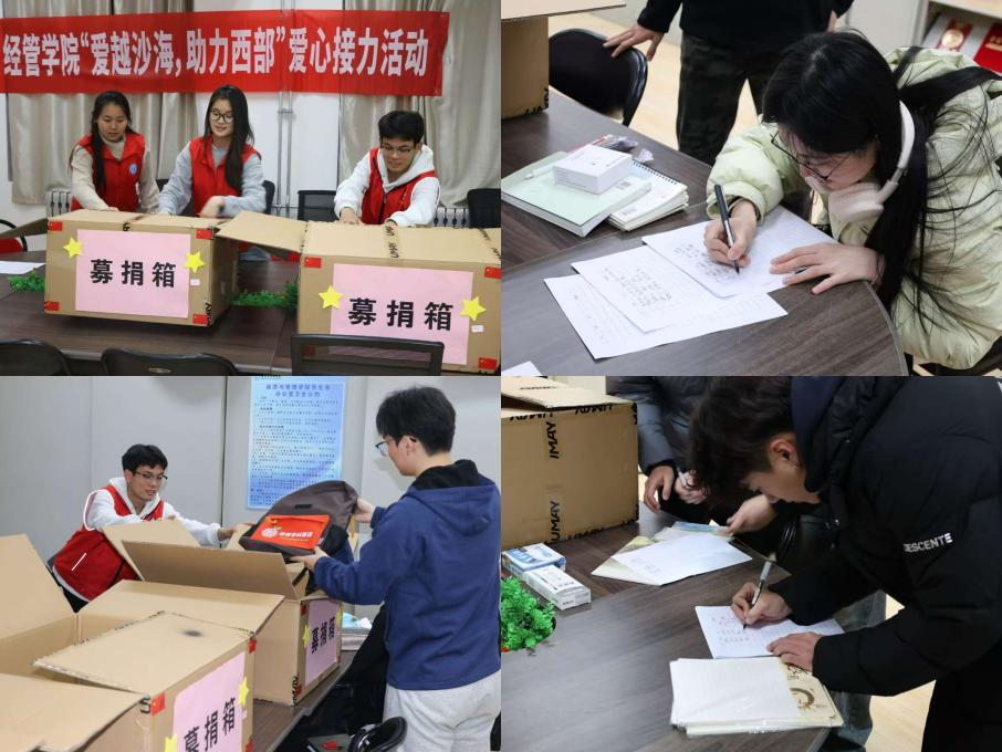 自校团委“爱越沙海,助力西部”爱心接力活动启动以来,经管学院团委积极响应号召,面向全院师生广泛深入动员落实,学生会、研究生会面向广大青年学生率先呼吁组织,教工党支部、卓越团支部、“暖心愿”协会陆续主动加入,在“12·5”国际志愿者日到来之际,经管学院师生以爱心捐赠书写奉献担当,让温暖跨越沙海,让爱心落地生根。