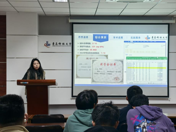 张缘聚焦“思想道德—综合素质—学术进展” 为脉络展开分享:思想层面,她在学院培养下筑牢思想根基,恪守学术诚信准则;学业上她稳扎稳打,课程成绩优异、综合表现突出,凭借扎实的学习积累收获了多次奖学金;学术与实践方面,她积极参与学科竞赛、学术研究及科研课题,在理论与实操的结合中拓展了专业能力。她的分享让同学们真切感受到,青春成长的答卷需以初心为笔、实干为墨来写就。