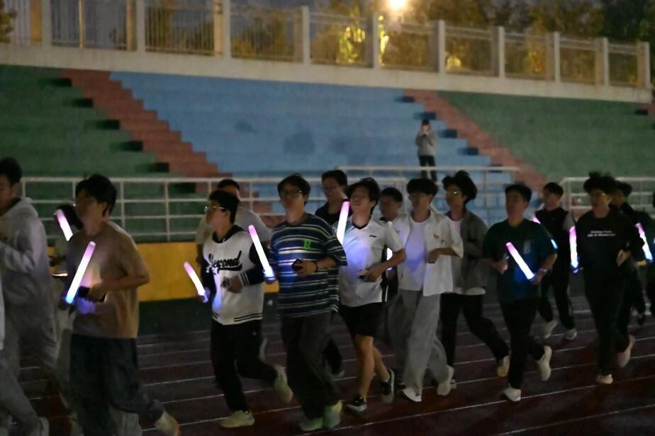 操场上,同学们手中的荧光棒汇成点点星芒,迅速连成一片璀璨的流光之海。在学院学生会体育部的精心组织下,一场别开生面的集体热身跑拉开帷幕。奔跑的身影与闪烁的荧光交织,仿佛夜色中跃动的音符,谱写着一曲动感的青春之歌。这抹跃动的光芒,是高分子学子面对未来的无畏与乐观;这场并肩的奔跑,更让每个人深刻感受,成长的路上,总有伙伴同行,汇聚成一往无前的磅礴力量。