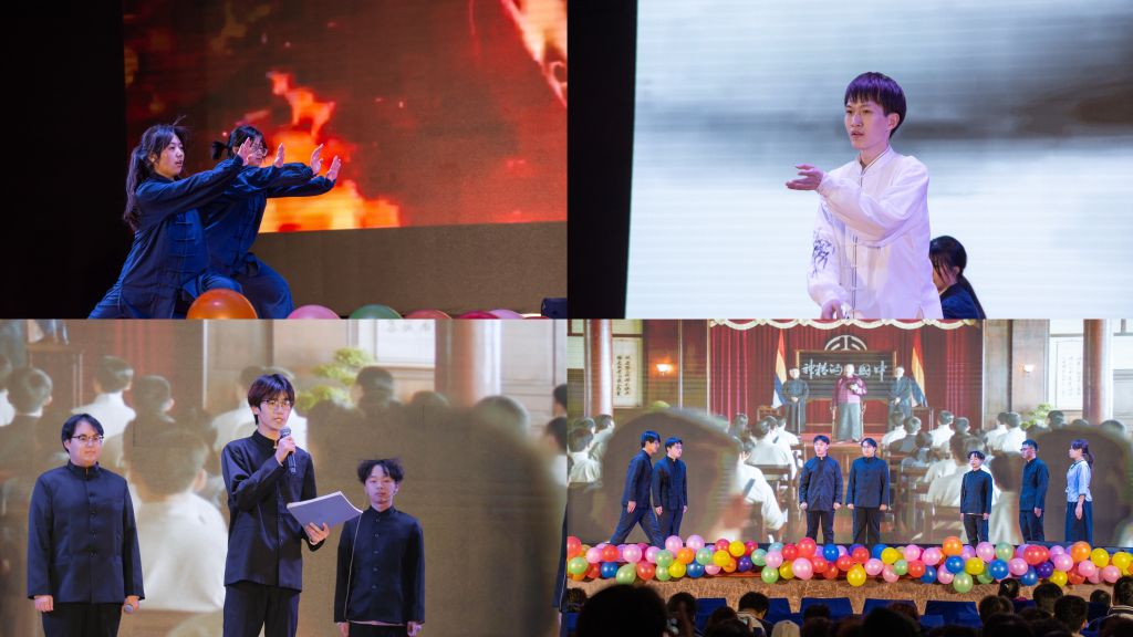 百年薪火相传,青春担当生生不息。第一篇章以初心为引,在历史与当下的交融中,传递奋进力量。歌曲《少年中国说》歌声嘹亮,青年们用责任扛起集体荣光,用行动诠释青春力量。武术表演《剑心武韵》刚劲灵动,一招一式尽显中华武术千年风骨,彰显浓厚民族气魄。话剧《觉醒》重现热血岁月,学子们用青春之躯扛起家国重任,用赤诚之心守护山河无恙,在历史长河中刻下永不褪色的“五四”印记。