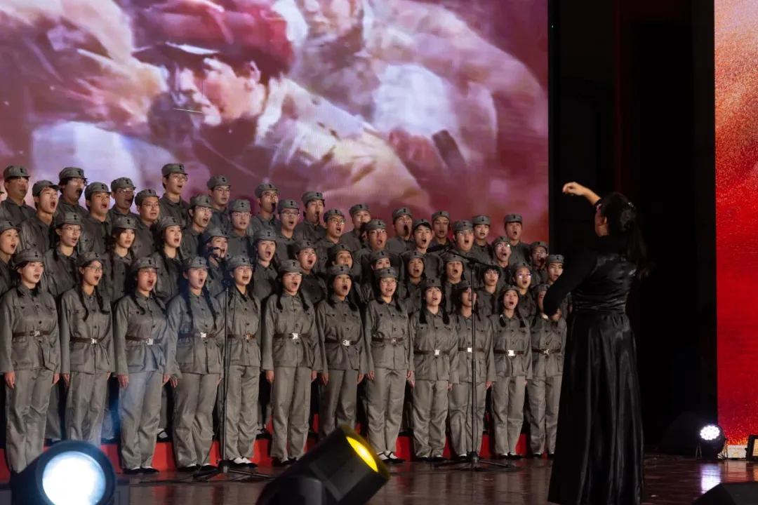 材料学院合唱队的同学们身着整齐服装,以饱满的精神状态亮相舞台。伴随着激昂的旋律,同学们用铿锵有力的歌声演绎,时而低沉婉转,诉说着中华民族的苦难岁月;时而高亢嘹亮,迸发着奋勇抗争的磅礴力量。每一个音符都饱含着对祖国的深切热爱,每一句歌词都传递着青年一代的责任担当。