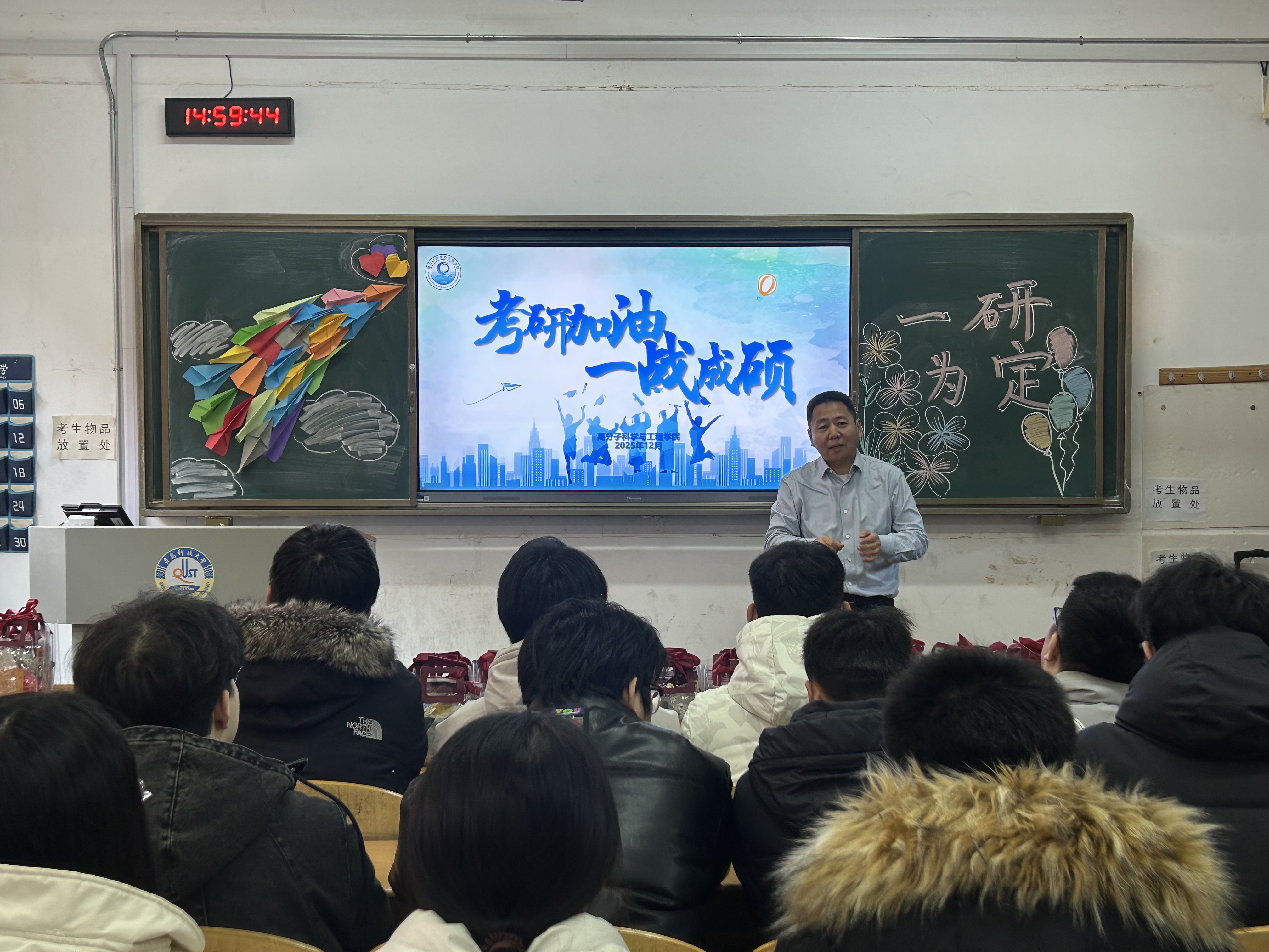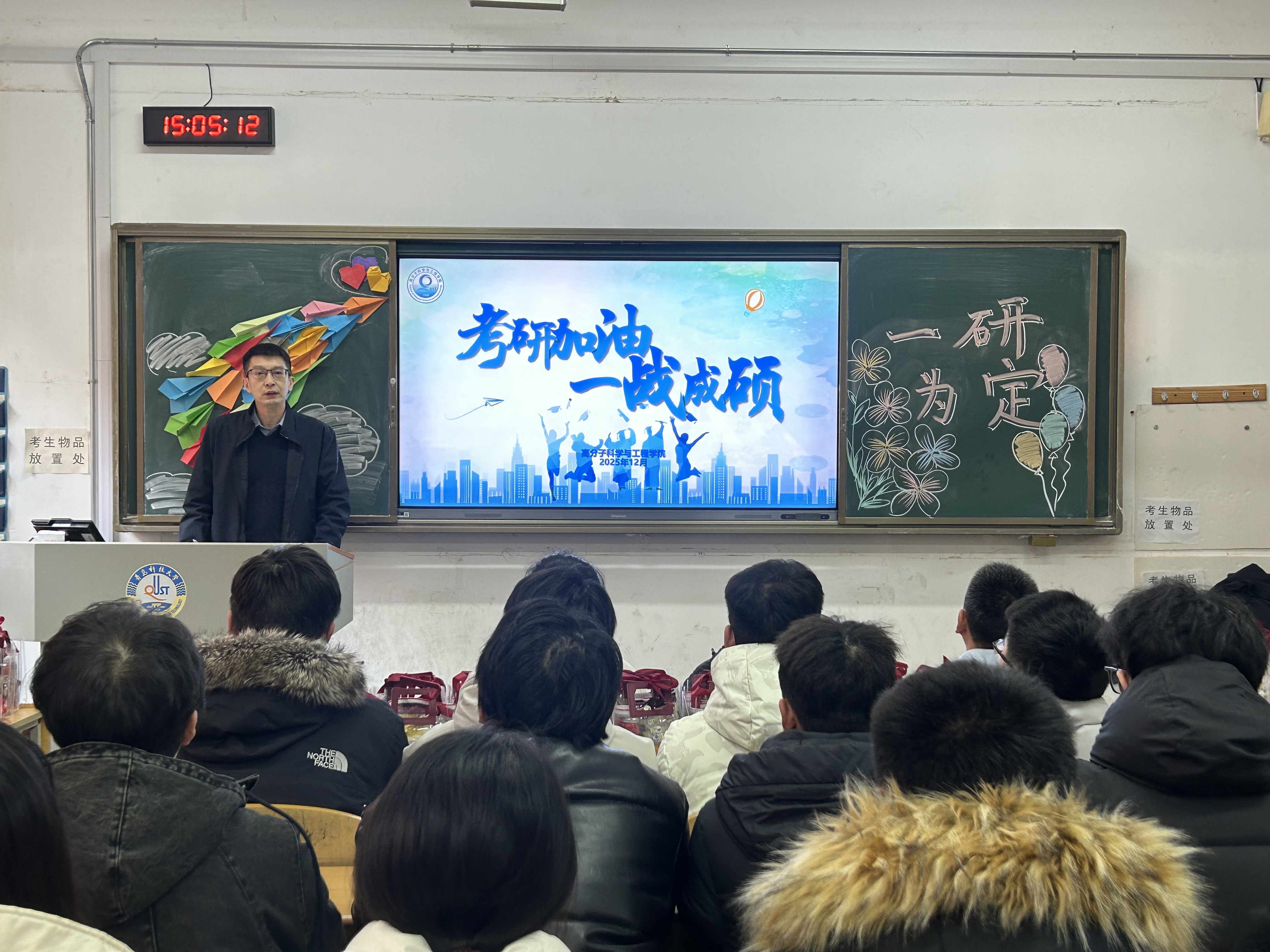 为鼓舞考研学子斗志,传递学院温暖关怀,12月15日,高分子学院在二教118举办2026届考研加油助力活动。学院党委书记宣宗伟、院长张建明、2022级班主任代表及辅导员老师代表参加本次活动。活动现场,宣宗伟代表学院,向孜孜不倦、全力拼搏的学子们表达了深切关怀与殷切期望。他高度肯定了大家长期以来的辛勤付出与执着坚守,并寄语同学们在最后阶段稳住心态,专注当下。他表示,学院始终是同学们的坚强后盾,将不遗余力为大家的梦想保驾护航。随后,张建明结合自身经历与当前考研形势,为同学们送上真挚鼓励。他指出,冲刺阶段不仅是知识体系的巩固期,更是心态调整的关键期,希望同学们坚定信心、沉着备战,以饱满的精神和从容的姿态迎接挑战,同时注意劳逸结合,保持规律作息与积极心态。