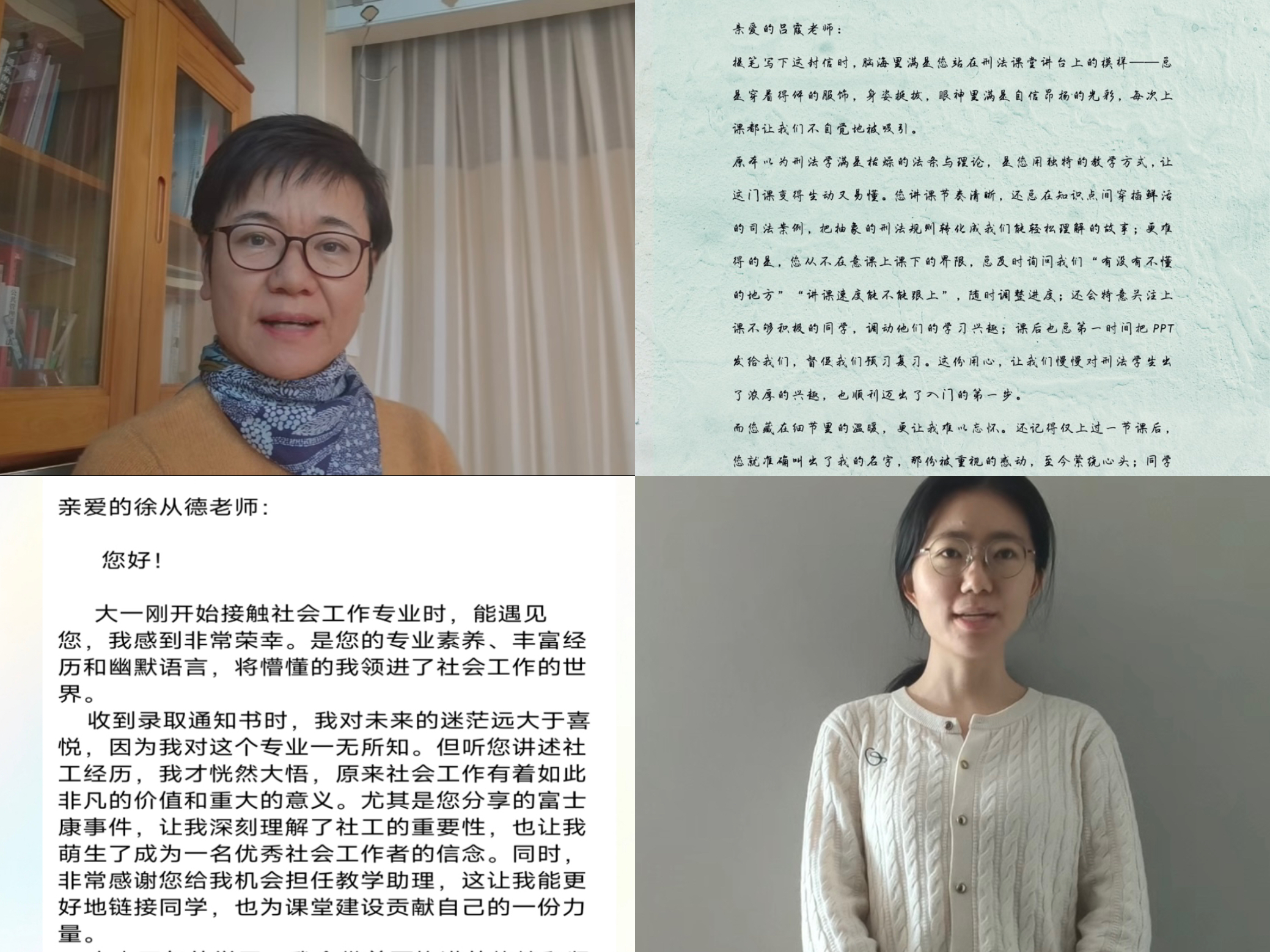 师爱如春雨,润物细无声。学院团委在线上开展“师影传心”教师视频分享活动,邀请老师们通过镜头分享教学心得与人生寄语,推荐启迪心智的经典好书,将深厚的育人情怀融入每一帧生动的影像之中。“致老师的一封信”征集活动同步开展,同学们以笔寄情、以声传意,通过书信和视频诉说师恩难忘,用真挚的文字和温暖的声音,传递对老师的深深感激。