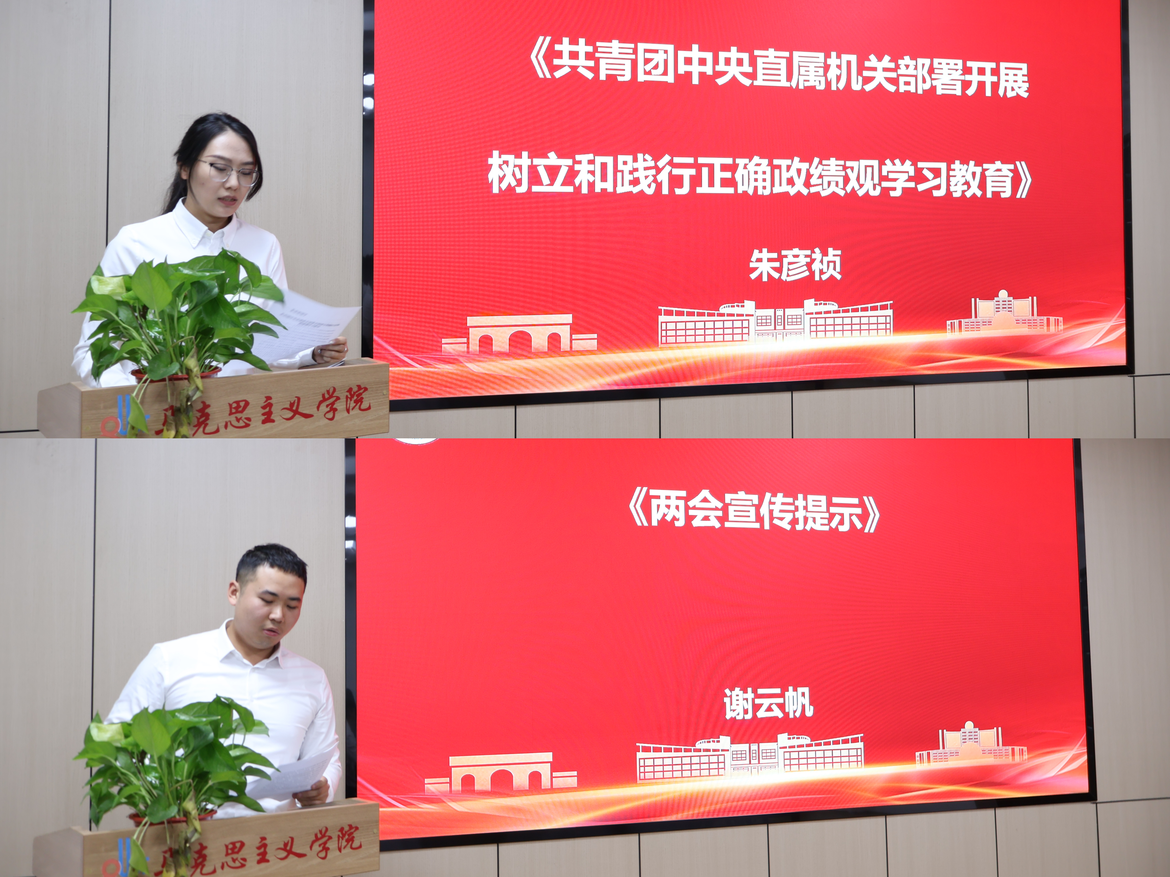 朱彦祯领学《共青团中央直属机关部署开展树立和践行正确政绩观学习教育》,并指出,青年骨干要不忘初心、牢记使命,摒弃懈怠松散心态,坚持实事求是、真抓实干,切实把正确政绩观体现在具体行动上。谢云帆围绕2026年全国两会宣传提示开展领学,详细解读宣传工作固定表述,引导全体骨干准确把握两会精神实质。