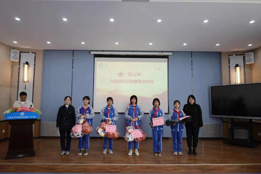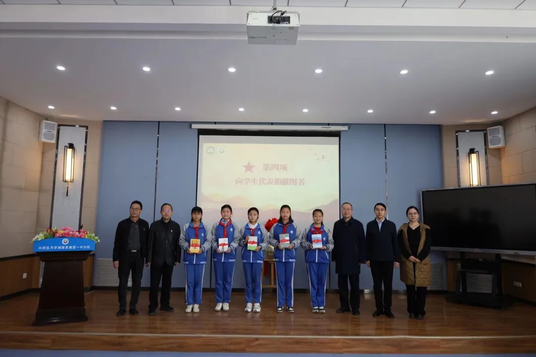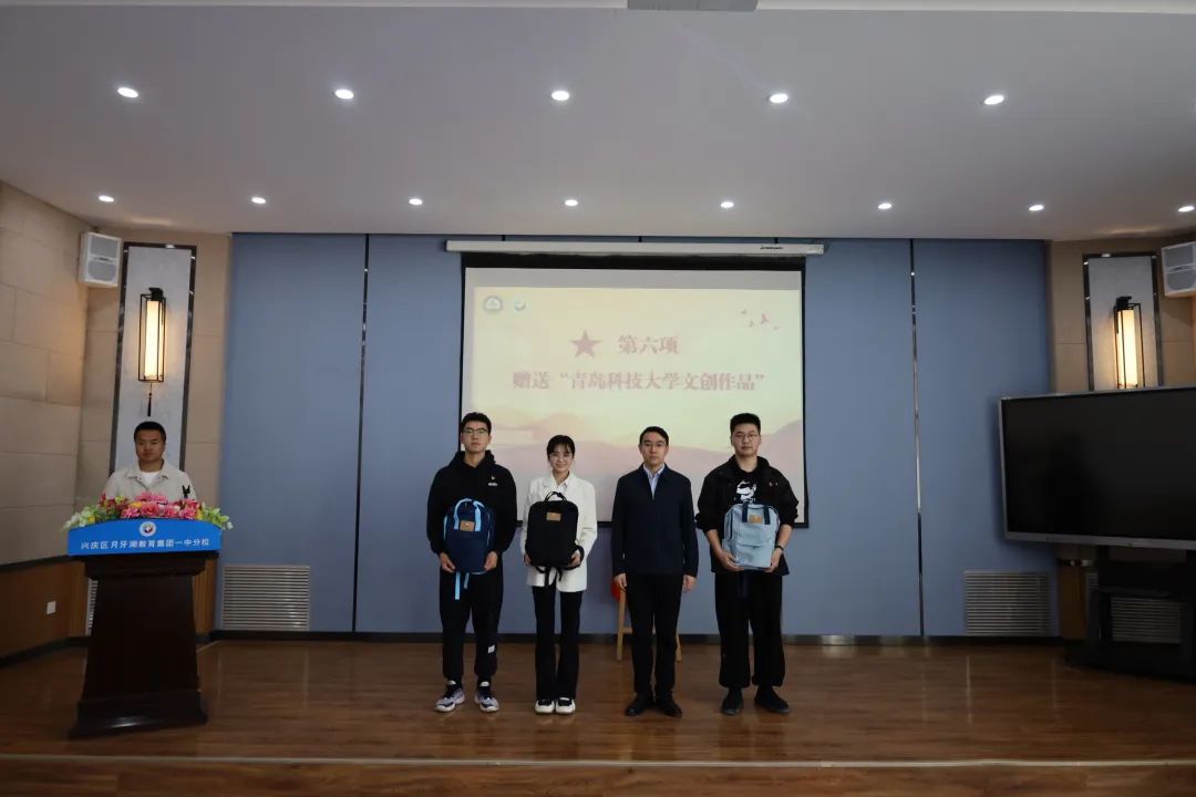 MILE米乐集团校友工作办公室主任王泽鹏、团委书记刘跃宁、党委学生工作部副部长徐华,共同向月牙湖教育集团一中分校赠送“MILE米乐集团文创作品”。