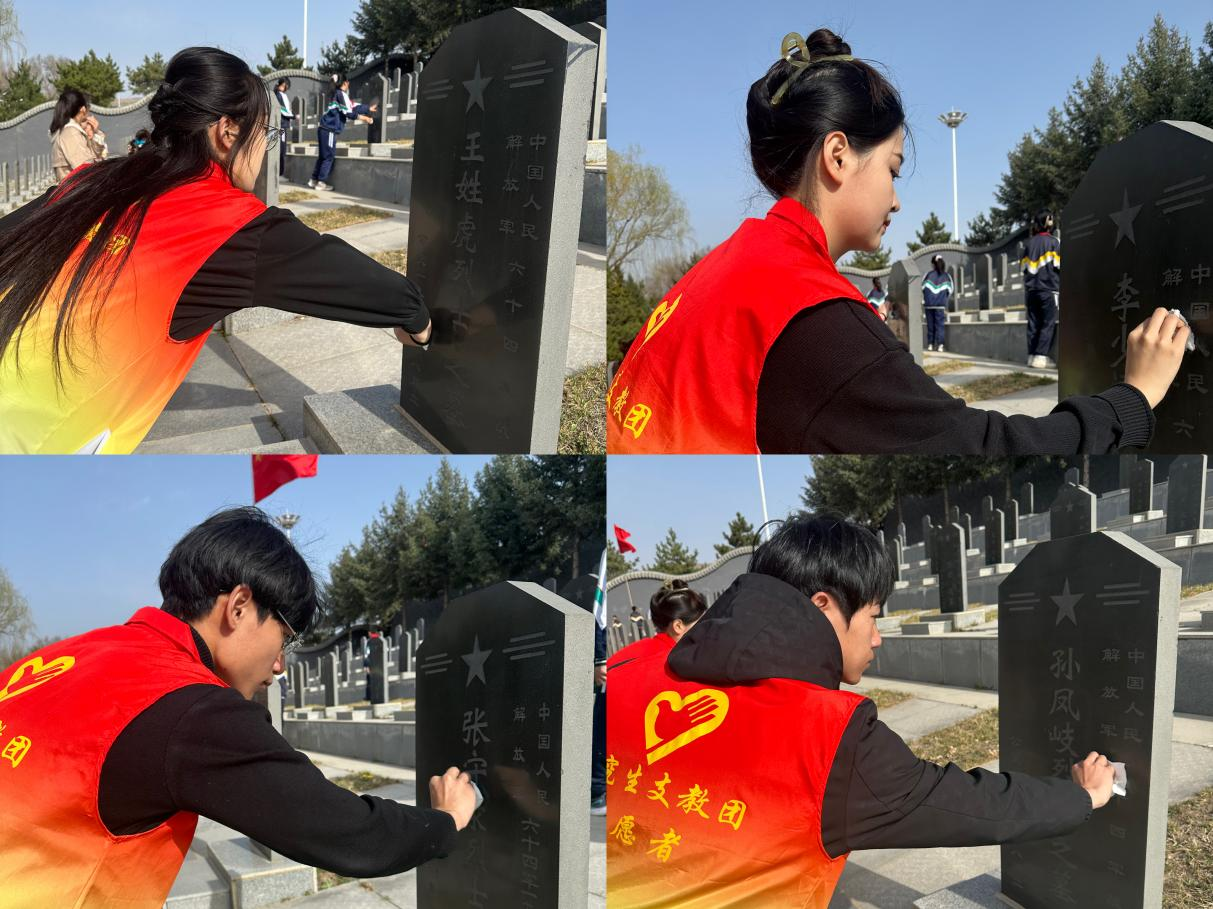 在清明之际,我校第25届研支团彭阳分队随同城阳中学来到任山河烈士陵园参加清明祭扫活动。活动中,支教队员在烈士墓前默哀一分钟,擦拭墓碑寄托哀思。随后,支教队员在团旗下重温入团誓词,以铮铮誓言继承先烈革命遗志,牢记对党和人民的无限忠诚。