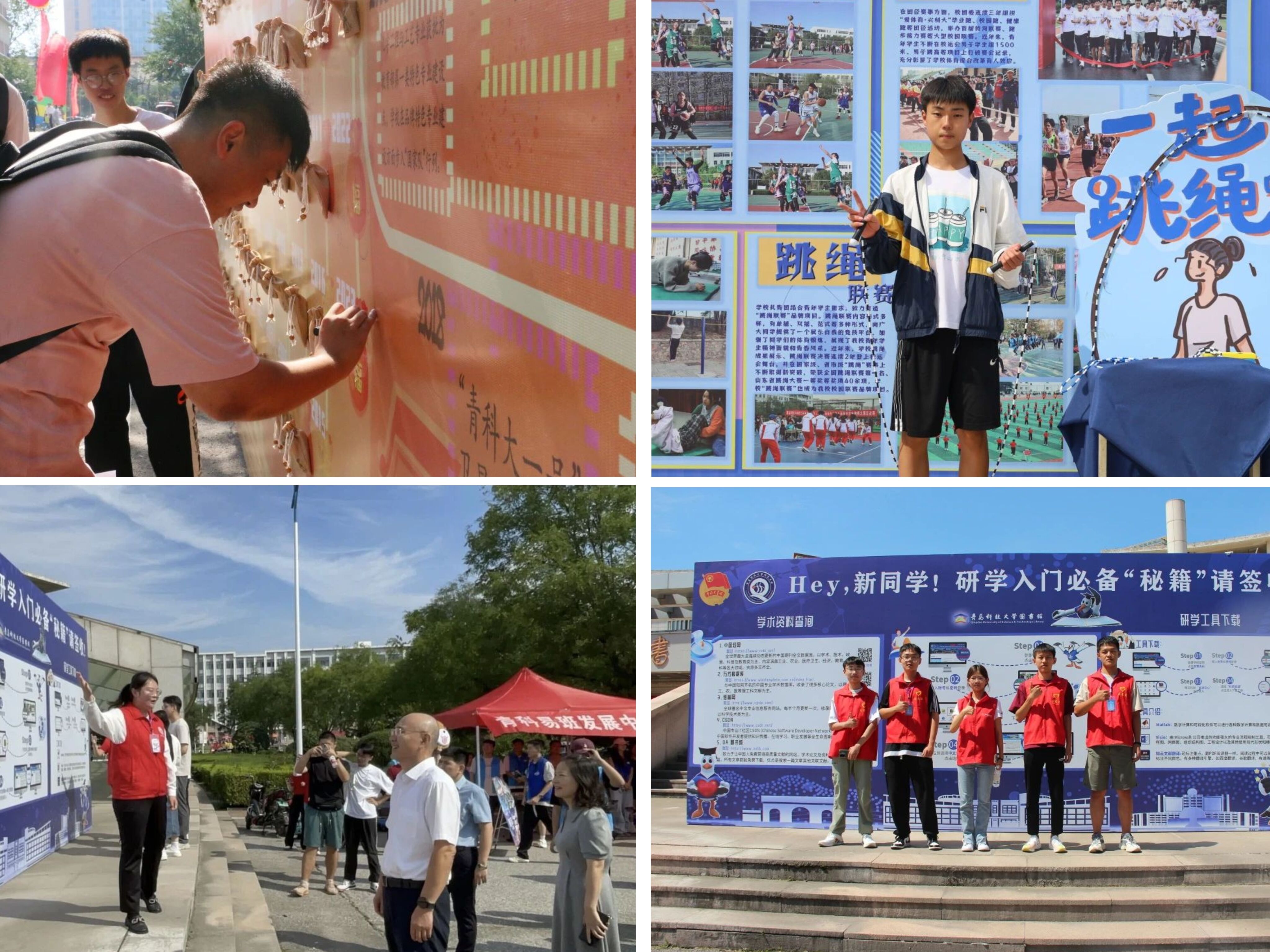 在迎新现场,校团委、校学生会、校研究会开展了独具特色的迎新活动。以一条时间轴展示学校的73年办学史、奋斗史的“梦启橡胶黄埔·追求向上人生”新生福袋领取活动、全方位展示校园体育文化风采的“爱体育·兴科大”新生跳绳挑战赛,让研究生新生体会学术魅力,激发从事科学研究的创新精神的“研学入门必备秘籍”学术墙。