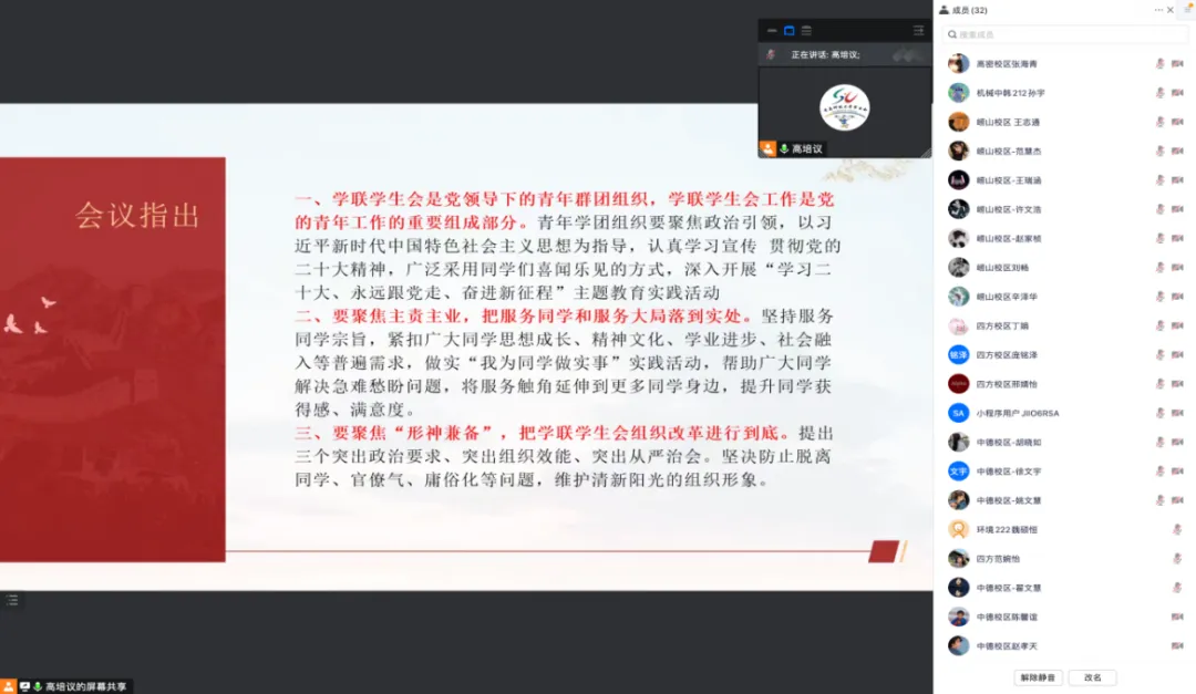 主讲人高培议同学带领四校区学生骨干原原本本地阅读了《关于认真学习宣传贯彻党的二十大精神团结带领广大同学坚定跟党走、奋进新征程的决议》《在全国学联第二十七届委员会第二次全体会议上的工作报告》和《中华全国学生联合会委员会、主席团工作规则(试行)》原文,并结合自身工作经验,向大家分享了学习感悟。