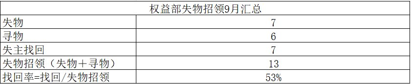 为帮助同学们解决物品丢失的困扰与难题,我们通过校学生会官方QQ账号发布失物寻物信息。九月份崂山校区和四方校区共发布7篇失物招领,6篇寻物启事,总计13篇,其中失物共找回7件,找回率为53%,帮助同学们更便捷地找到丢失物品。