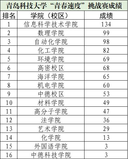 为全面推进学校体育综合改革进程,响应学校“爱体育•兴科大”的号召,丰富校园文化生活,增强学生体质,培养团结意识,学校于5月7日下午在崂山、四方、中德、高密四校区举行“青春速度”挑战赛。